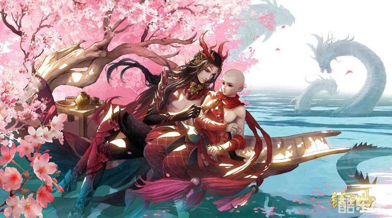 有萌萌的治愈神龙,自然也免不了脑洞大开的天命者来一头“黑化”的神龙作品。这幅由“黑色禁药的窝”执笔的同人画,用冷暖色调的强烈对比,塑造了一个桃花树下、清澈湖畔,泛舟其上的经典爱情场景。