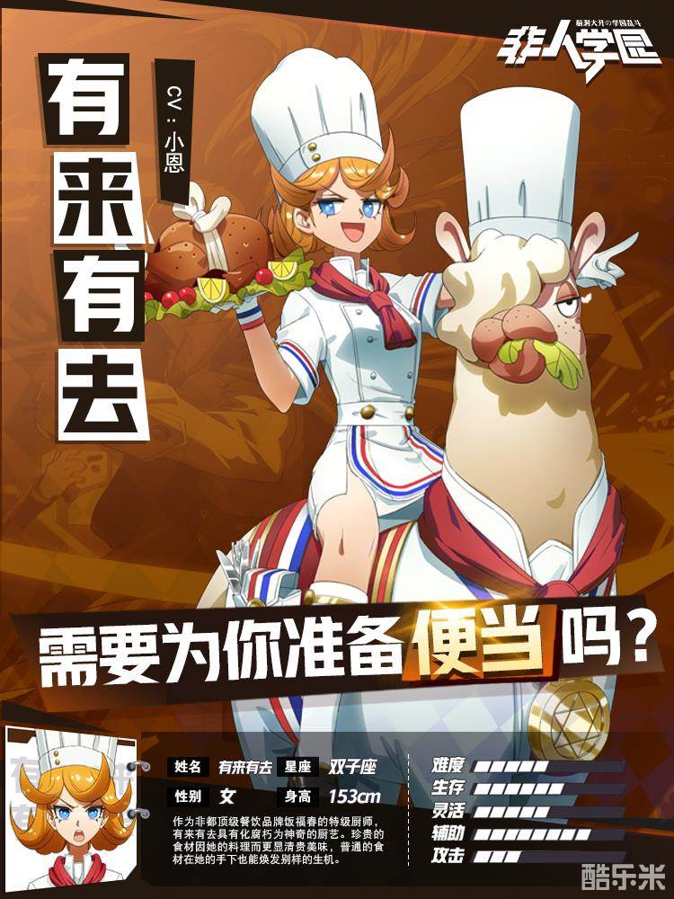 《非人学园》感恩美食节即将美味收官,非都最强五星大厨有来有去惊艳亮相,用高超厨艺征服了所有人的胃!骑着草泥马奔驰而过,随手投喂队友美食,把黑暗料理塞进敌人口中,作为新生代强力辅助英雄,有来有去在学园战场上凭借出色的位移、控制、恢复技能,展现出了无与伦比的战力。同学们,快来感受有来有去的非凡厨艺,领取免费英雄、感恩节限定称号等多重福利吧!