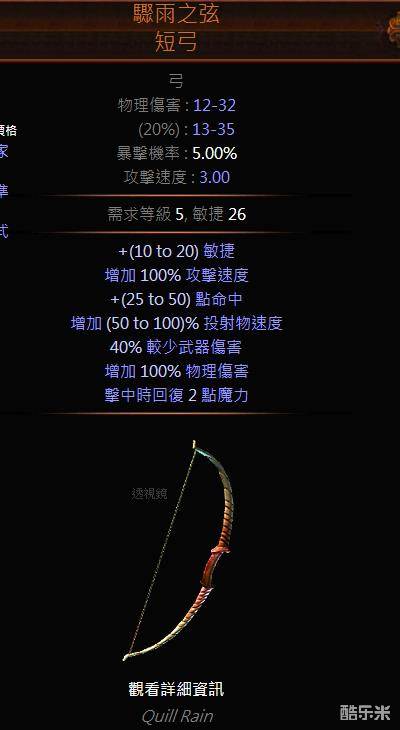 对,你没有看错就是这把鸟弓,2.6版本鸟弓更少伤害从50%降至40%,增加了100%区域物理伤害,并且击中回魔+2。