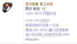元素要害,易燃,导电,冻伤:这4个诅咒效果类似,降低抗性。我们来做个计算就可以,通过戒指的降低效果,实际我们只要承受20%效果,那么,(44+39)*0.2=16.6,所以我们的抗性标准是多撑16.6的全抗就行。原来的标准是135,现在变成了135+16.6=151.6,所以全抗不低于152就行,我们可以补抗性的地方很多,根本不是事啊。