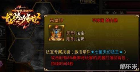 神灵幻化,亦梦亦幻,真假难辨。但不管真假,玩家都需要认真对待,因为神灵本尊也可能混在一群幻象当中。玩家击退幻象,幻象化作缥缈;一旦击退本尊,则有机会得到轩辕法宝“东皇钟”的碎片。集齐一定数量的碎片就能激活吞噬诸天的法宝“东皇钟”,在游戏中该法宝能让人物附带攻击特效,攻击的时候有8%的概率将对方武器打落回背包,简单来说就是一种“缴械”效果。