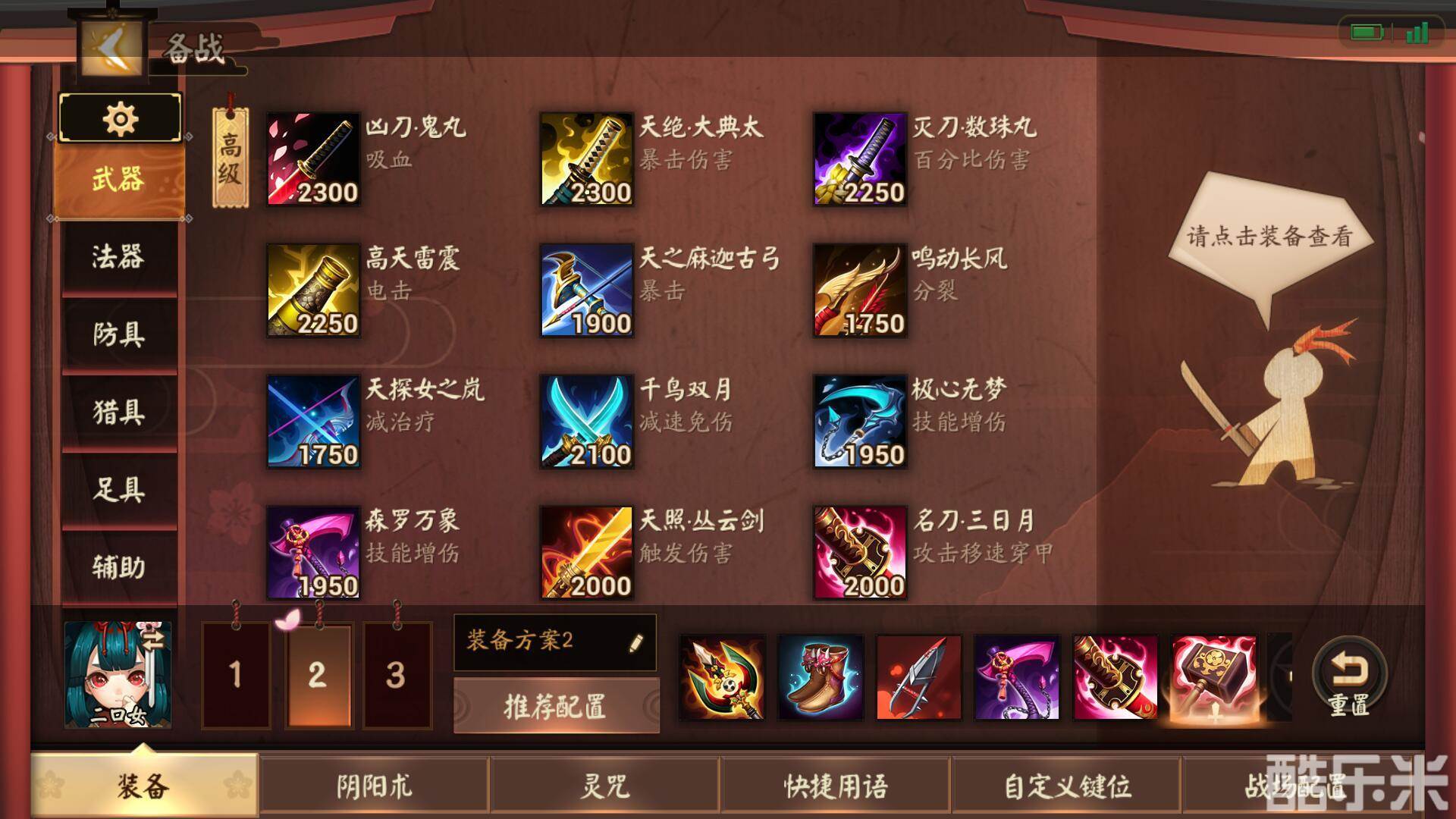 修罗枪保证二口女普攻伤害,法穿鞋保证二口女的二技能爆发伤害,小吸血刀保证她的续航,森罗万象增加她的技能伤害和收割残血能力(森罗万象被动效果为对生命值低于百分之四十的式神进行普攻会造成格外伤害并降低其移速,该效果有时间限制),名刀保证二口女的物穿和技能CD,最后的罗刹王古槌增加了二口女的生存能力。这里解释一下为什么不出极心无梦,因为极心无梦的减速效果只有近战式神才能触发,而二口女作为远程式神显然出森罗万象更适合。
