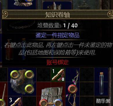 其中蓝色和橙色的修饰词不是固定的,但是总体来说修饰词越多则说明该装备越好,可以看到其中橙装显示是未鉴定,未鉴定的装备无法穿戴,这个时候我们就需要下方的鉴定卷轴(知识卷轴)