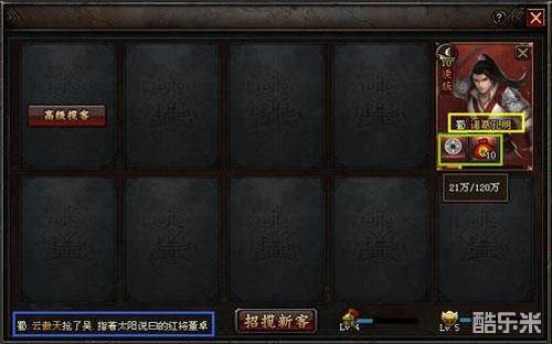 可招募红色武将的种类,由酒馆等级决定,全服所有玩家抢夺红色武将的银币花费将转换为酒馆经验。