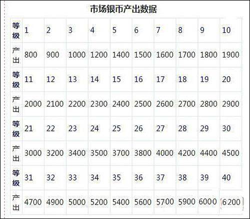 铁骑冲锋游戏中市场是银币最主要的获取途径,下面小编就为大家分享下游戏中1-40级市场的银币产出数据。