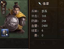 张梁是新手玩家进入游戏完成新手任务后可以招募的将领,初始可统领六队步兵,帮助玩家征战沙场
