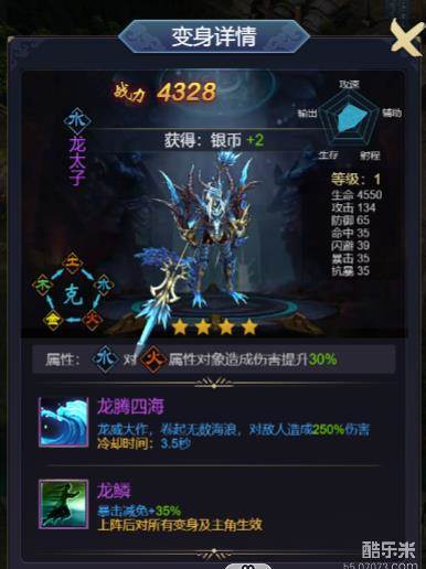 西游七十二变平民变身之龙太子战斗力解析。今天给大家介绍一个相对平民一些的变身。这回要说的就是龙太子,一个四星变身。下面就来看看龙太子的真实实力吧。