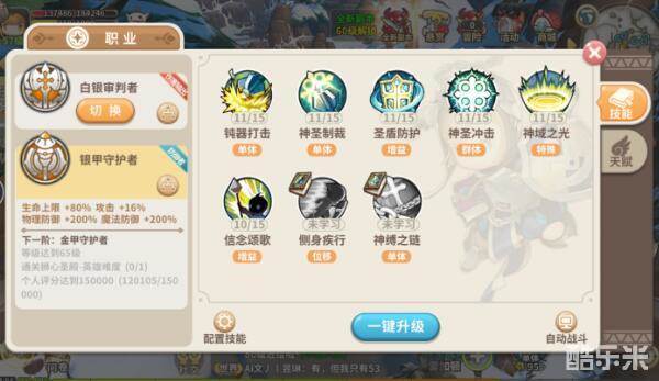 除主坦的玩法外,守护者也可以担当队伍中的辅助。像神域之光、神缚之链、信念颂歌、神耀冲刺等技能,都可以为队友瞬间提供大量防御力和攻击力的加成,在BOSS释放强力大招时,能够为队友加持强力的BUFF,避免队友被秒杀的情况。总之,合理地使用这些辅助技能,将决定你是否能够击败BOSS顺利通关。