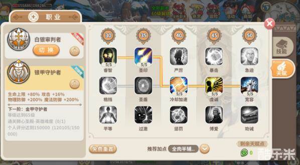 守护者拥有数十种不同的技能和天赋,可以随意组合搭配。如果你在队伍中承担着主坦的职责,技能就要选择像圣盾防护、神圣制裁等能够增强自身防御、并吸引BOSS仇恨的技能;而天赋则可以考虑提高治疗效果和格挡效果的睿智、重盾。如果觉得自己和“纸片”一样脆,那就要重新审视一下技能和天赋的搭配是否合理哦~