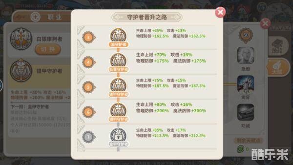 职业分析:守护者拥有超高的血量,还能够治疗自己为队友提供buff,虽然防御加成与骑士相比略低,但是生命值的加成较高,拥有很强的自保能力。