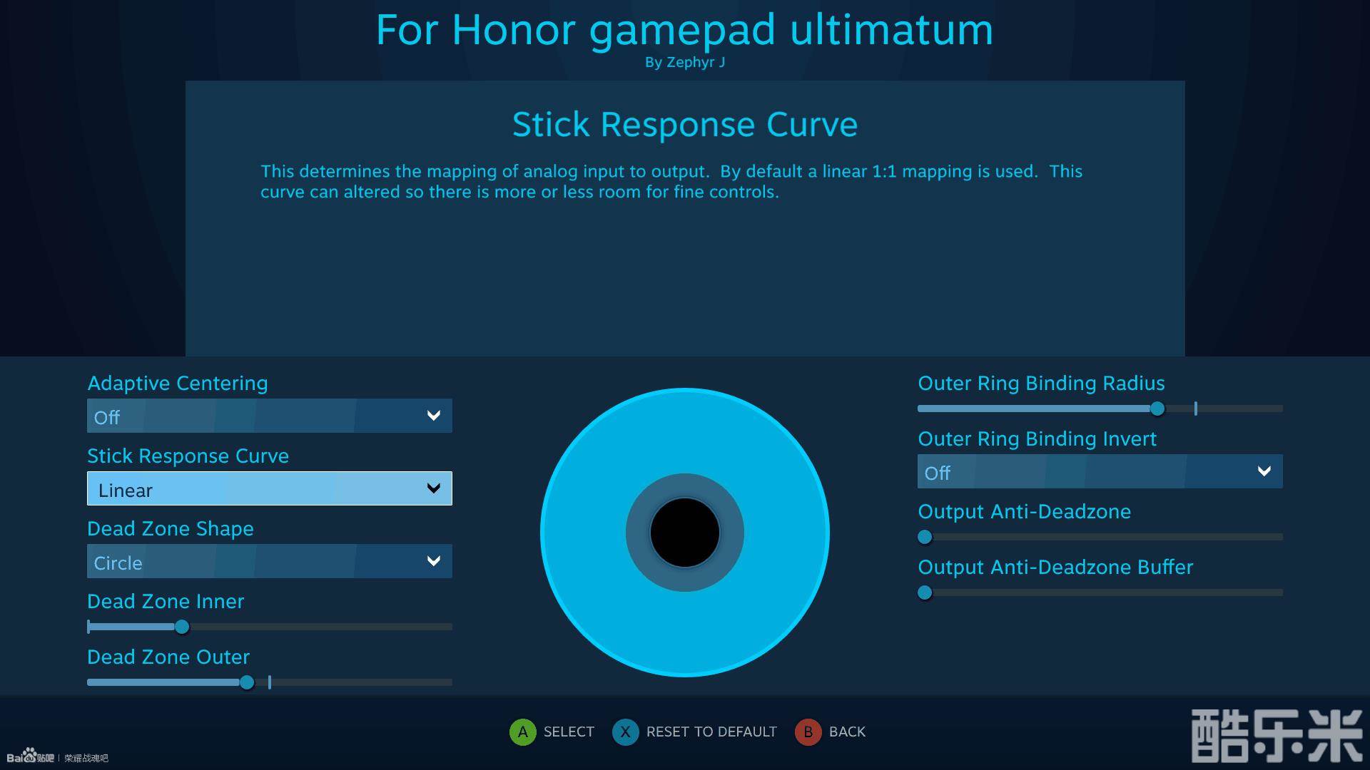 在底下选取advanced setting(高级设置),dead zone inner(内部死区)看下图黑色区域调出一块够放拇指的位置就好,不用太大,把dead zone outer(外部死区)右图中亮蓝色区域调到尽量大(数值尽量小),给黑蓝色区域留一点过渡就好了,这样能帮助我们更快地切换防御方向