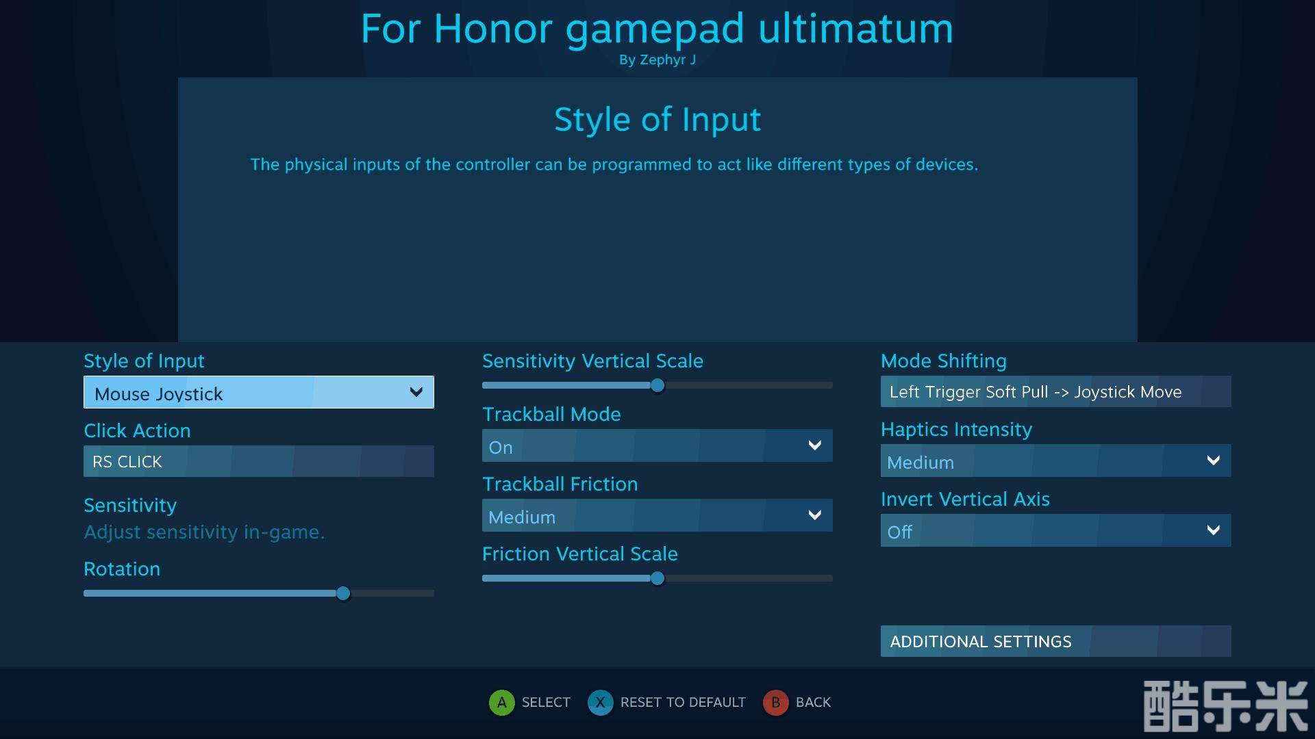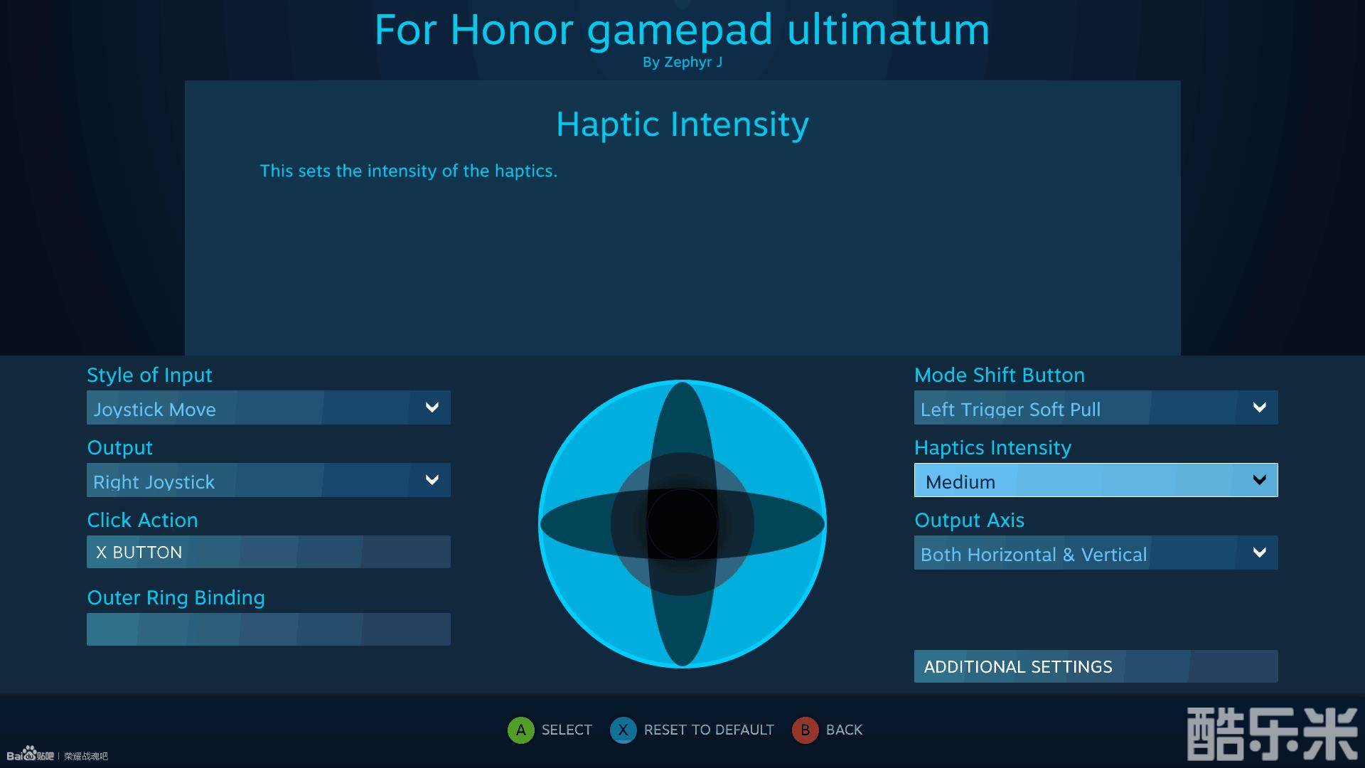 右触控板:改成mouselike joystick,按下为RS click(重置视角),震动等级根据个人习惯调(我喜欢中等),