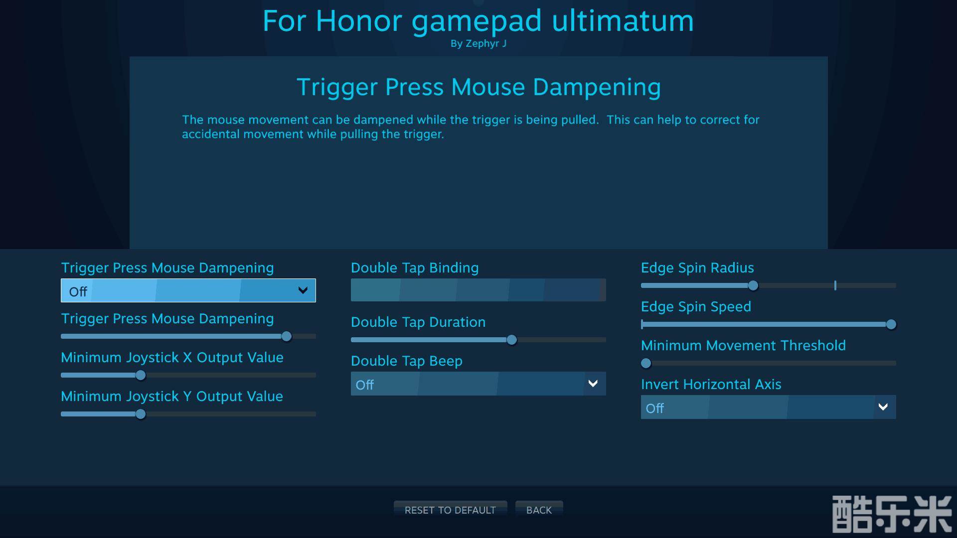 接着进additional setting(额外设置)右边把edge spin radius(边缘半径调到二分之一左右),下面edge spin speed调到最大,这样的设置在非防御模式下镜头移动会更舒服和自然,操控性也强一些(滑动触控板控制镜头不会转过,手指放在边缘面积内镜头转速变快(手指放在触控板上不动时,一直有反馈的地方就是‘边缘’)。