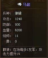 马超的初始属性于孙策相当,攻防在骑兵紫将中属于中流水平。