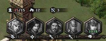 马超的攻击力增加是在自身头像上有显示的,以上图可见,攻城战中登场12名马超,3名弓兵,则马超攻击力增加3%,实际攻击力显示为103%,其他玩家的士兵不能给马超带来加成。