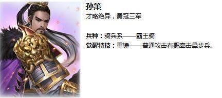 答:孙策觉醒特技:重锤---普通攻击有概率击晕步兵。