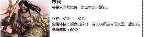 觉醒特技:颜良出兵时,有50%概率带领文丑一起出兵。