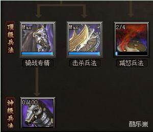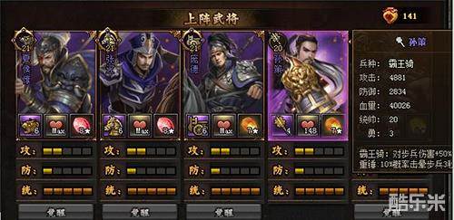 配置如下:宝石88776,四紫将+孟获(孙策已觉醒),宝物5个黄1和1个绿1,兵法减怒2级击杀满级。