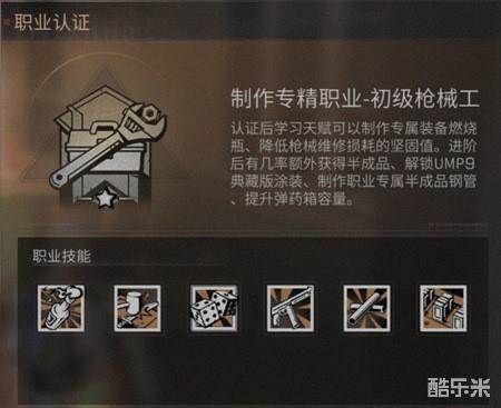 能够降低我们维修枪械时,所消耗的坚固值,让一把枪可以用的更久,而且还可以制作职业专属的武器燃烧瓶,职业专属的半成品钢管以及职业专属的图纸UMP9典藏版。