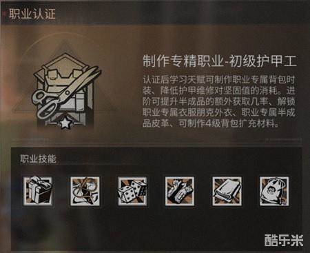 能够降低维修护甲时所消耗的坚固值,还更快的拥有更大的背包空间,能够制作职业专属的背包时装礼盒,能够制作专属半成品皮革,以及制作职业专属的时装朋克外衣。