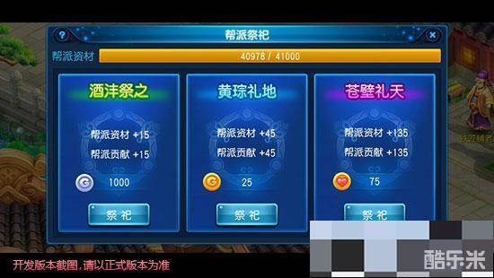 为帮派祈福,消耗一些贡品(银子、金子、桃心),获得帮派资材与帮贡。
