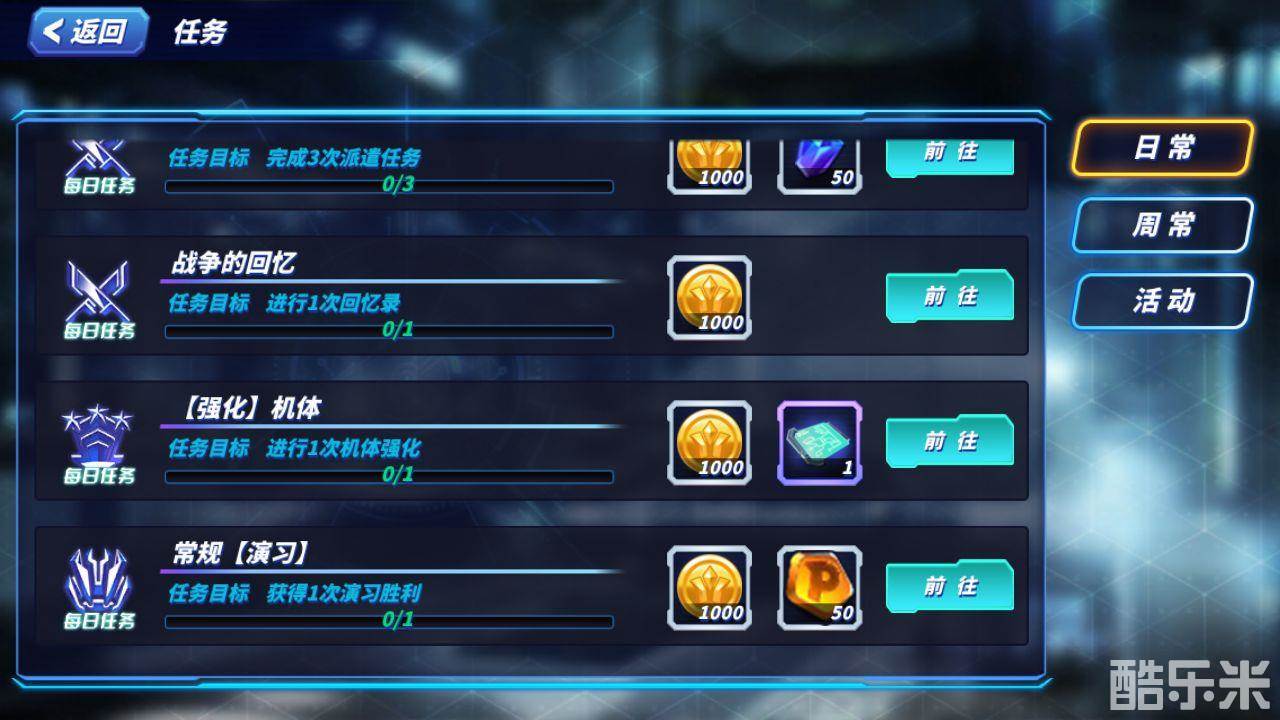 日常任务里有许多小目标,完成就可以获得资金(全球流通货币,由地球联邦银行发行)、晶石(品质很高的稀有矿石,用于黑市交易)、扭蛋用的补给券等资源,前期资源积累和过渡来说,这是一笔不菲的福利,所以建议每天都要做一些。比如常规的派遣、回忆录、机体研发、出击、演习胜利等等,均可以获得道具奖励。