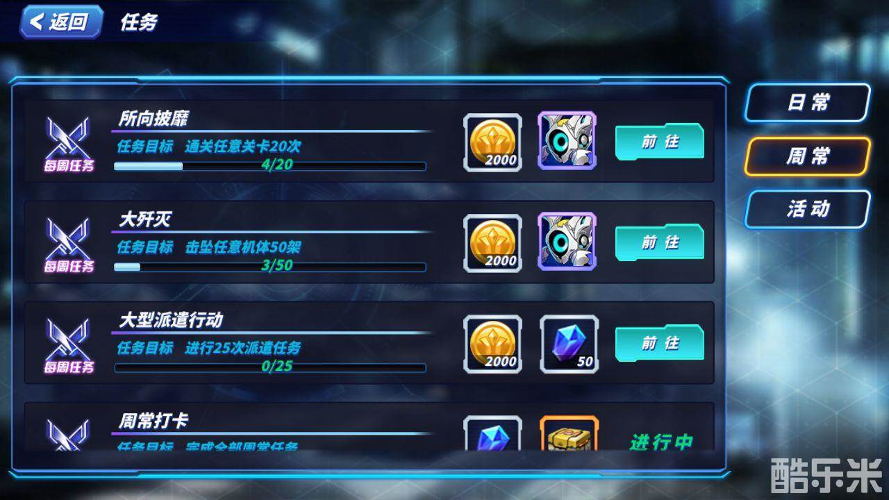 完成周常任务除了可以获得资金之外,还可以获得材料机师、周常奖励礼包和图纸等高级材料,让你在机师、机甲的培养之路上更加得心应手。通关任意关卡20次、击坠机体50架、进行25次派遣任务等,10次机体强化、机体研发等都会获得周常任务奖励。