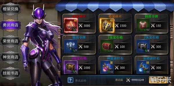 只要在日常和限时玩法中每日参与竞技场,职业首席,日常悬赏和公会悬赏等活动,就会积累到海量的荣誉值和勇武值。使用勇武值和荣誉值兑换珍稀物品是非常经济和实惠的提升手段。