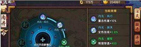 内丹中一共有七个槽位。玩家获得丹元后可通过注灵的方式将之注入内丹的槽位中来提升内丹的效果。然而内丹又分为几种属性,不同丹元加成不同属性,玩家在注入丹元后,将获得丹元属性加强。