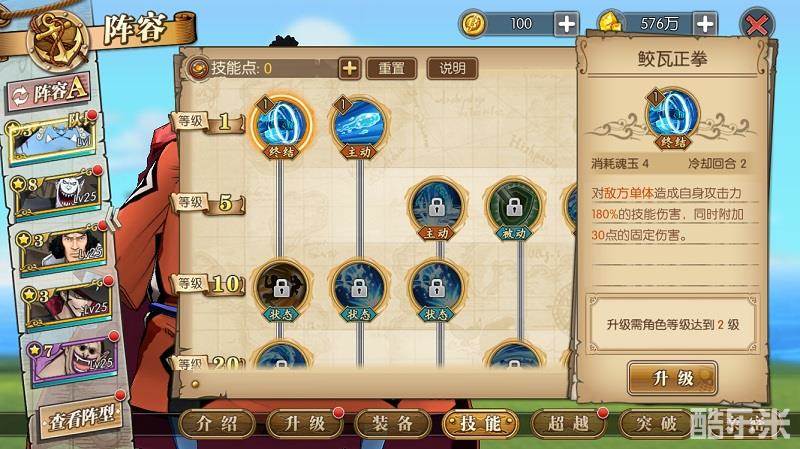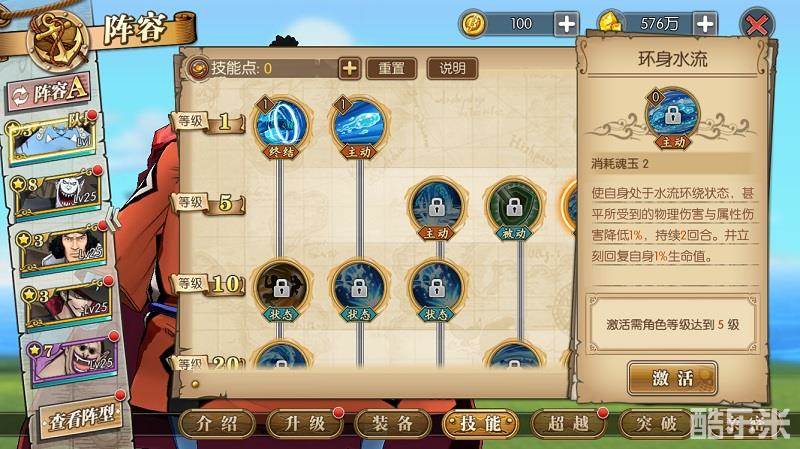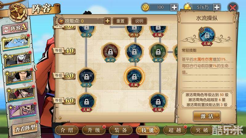 接下来我们看一看甚平的技能树。首先看他的主动技、终结技和奥义技。击水、群鲛、水心·海流过肩摔是群攻技能,范围比较大,伤害一般般。鲛瓦正拳、武赖贯是单体技能,伤害值意外地还可以。如果是我的话会选择大范围覆盖+单点集中爆发的攻击方式,比如击水+水心·海流过肩摔+武赖贯这种组合。