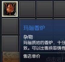 宝箱能开出来的东西可谓是千奇百怪,有绝技心得、破障丹、帝女花等各种道具,如果你挖到了玛瑙香炉,那就把他卖给商店换取银子吧!