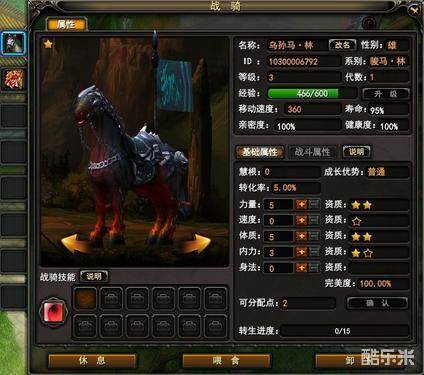 2.右键使用此战骑,可将战骑装备到战骑界面。打开战骑界面可以看到该战骑的各种属性,如:等级、技能、成长优势、基础属性、战斗资质等。