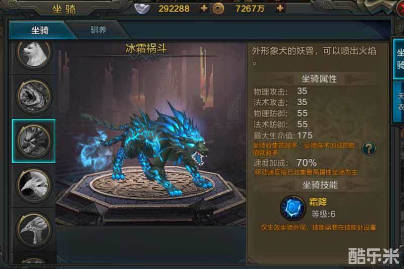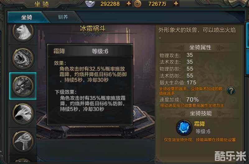 冰霜祸斗坐骑的技能是霜降,角色攻击时有32.5%概率施放霜降,灼烧并且降低目标6%防御,持续5秒,冷却30秒,这是6级时的技能效果,技能升级后提升触发的概率。这个技能与海煞的坐骑技能很相似,都是降低目标防御的,不过技能升级的数值提升有所不同,海煞的技能是固定30%触发几率,升级后提升降低防御的数值,在6级时降低6.5%防御力,每升一级多降低0.5%。在技能等级较高时,冰霜祸斗的减防能力低于海煞,这个技能比较适合副本、九黎入侵等PVE玩法。
