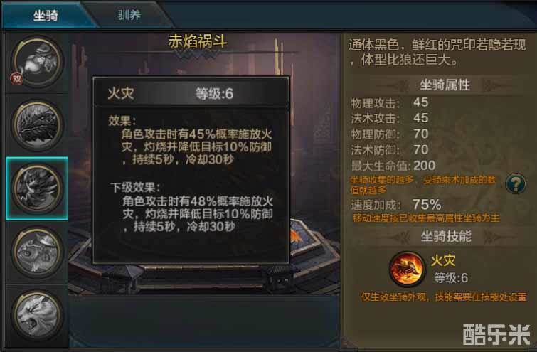 炽焰祸斗的坐骑技能是火灾,角色攻击时有45%概率施放火灾,灼烧并且降低目标10%防御,持续5秒,冷却30秒,这是6级时的技能效果,技能升级后提升触发的概率。炽焰祸斗的技能是冰霜祸斗的加强版,技能的触发概率和降低防御的数值都有较大的提升,10%的降低目标防御可以持平3级技能的海煞,甚至可以媲美一些职业的减防技能。尤其是那些缺乏减防能力的职业,在触发了炽焰祸斗的技能后对输出提升很大。