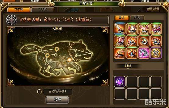 每件装备(包括10件套装、戒指、勋章,翅膀除外)都可以召唤一个星座守护神,守护神附带一个天赋属性,属性值随机,属性区间与品质相关。装备开启守护神时,需要消耗召唤石和银币,召唤石可在商城直接购买。目前女神只开放了“大熊座”守护神,后续将会带来更多更强悍守护神,大家敬请期待!