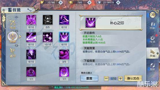 然后,开启这个天赋需从第一层极光壁垒点起,首先分配6点极光壁垒,因补心之印需在本系投入11点天赋,所以貂爷第二个加点选择暗影庇护,同样是分配6点,后再分配6点于补心之印。另外,补心之印最高可使我们在PK被暴击时恢复10%气血,因此貂爷建议有需要的道友可以点满。