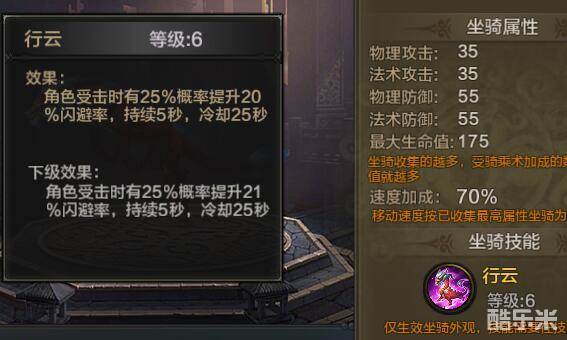 行云:角色攻受击时有25%概率施提升20%闪避率,持续5秒,冷却25秒,这是6级技能时的效果,升级后会提升闪避率,每升一级增加1%闪避率。应龙的坐骑技能是一个防御型技能,提升5秒闪避率可以在战斗时降低所受到的伤害,比较适合魔医和猎杀系弓手职业,因为这两个职业的闪避率都比较高,并且都有增加闪避率的技能或被动技能,如果在战斗中再触发应龙的技能,可以让闪避率大幅度增加。