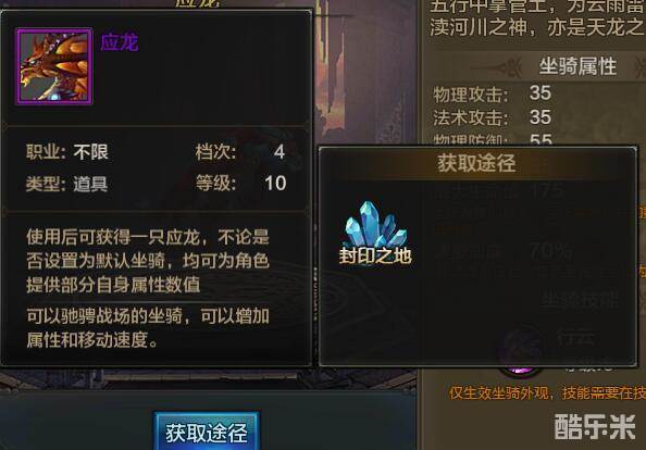 总结:在坐骑驯养和异兽志玩法开启后,玩家们对坐骑的需求量也是大大增加,应龙是封印之地产出的全新坐骑,封印之地黄金宝箱才有几率获得坐骑碎片,应龙的外观也颇受玩家喜爱。