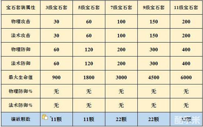 优化后的各阶段宝石套装属性都有了小幅度的提升,比如9级宝石套,优化前攻击属性为150,防御属性为300,最大生命值为4500,而在优化后,攻击属性提升了30点,防御属性提升60点,而生命加成直接提升了900点。当然最大的提升和优化还是11级宝石套之后的高等级宝石套装,新增了两类防御%。要知道我们的宝石套装属性直接加成于角色,假设角色物理防御18000,而11级宝石套加成1%物理防御,便可直接为角色增加180点物理防御,以此类推,15级宝石套增加15%物理防御,则角色物理防御可增加2700点,差距瞬间体现。