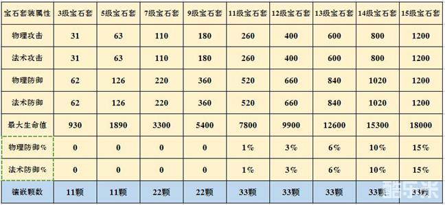 如上表,在第六部资料片龙争虎斗发布前,宝石套装属性比较单一,11级宝石套装属性比9级宝石套装属性攻击只高了50,防御多了100,高等级宝石套装属性优势不明显,但是所需要的文钱去却是几倍之差。9级宝石套装需要装备22颗9级宝石即可,而11级宝石套装则需要33颗11级宝石,可见成本的高低。而在最新的资料片中,我们的宝石套装属性得到了优化与提升,特别是在11级宝石套以后多了一类防御%属性。