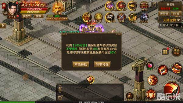 玩家可以花费200元宝对镖车进行投保,投保后即使镖车被砍毁奖励不受损失且额外获取10%经验加成。若护送完成时镖车未被砍毁,则返还80%费用。首日和低于55级玩家可免费投保哦!