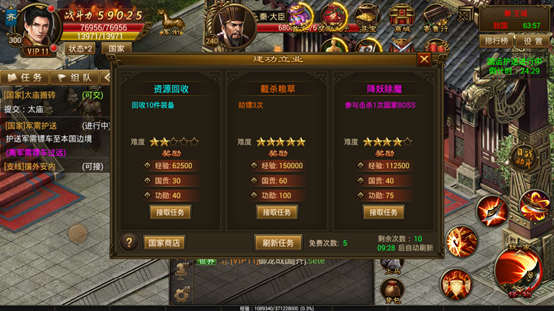 建功立业是御龙战国的特色玩法之一,每次都会刷出不同的任务。每个任务有难度区分,难度越高奖励越丰厚。