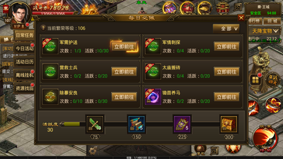 在每日必做界面中可以一览并领取日常任务,完成相应任务获得活跃度,更能获得日常大礼包(日常大礼包含有两把寻宝钥匙!)
