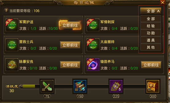 每日必做会优先推荐当前收益最高任务活动,右上角可进行任务活动筛选
