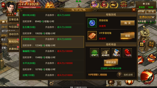 1.退出游戏后,离线挂机会开始进行,获得奖励与玩家的挂机效率有关,战斗力越高效率越高
