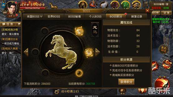 在《御龙战国》中击杀任何BOSS都将获得BOSS积分,BOSS积分可用于激活圣兽魂灯,提高个人属性。使用BOSS积分令牌可以直接获得大量BOSS积分,BOSS积分令牌每天有使用限制。