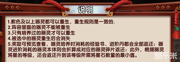玩家中前期在获得的多余的资源,在回收功能开启后进行回收处理。回收会以各类的资源货币进行存储,玩家可以使用资源货币进行购买其他自己需要的资源。已经培养过的装备、器灵、古宝、器从、宠物都可以进行重生,需花费50元宝,培养所使用的资源也都会全额返还。