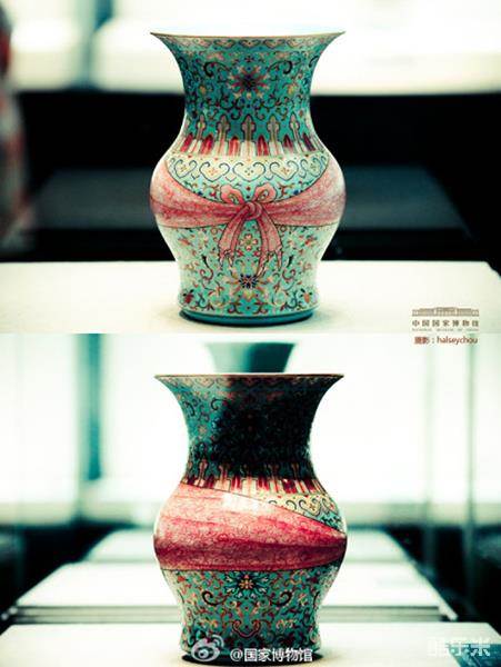 【包袱尊】以装饰包袱皮而命名的尊。流行于清乾隆时期。撇口,收颈,溜肩,圆鼓腹,腹下渐敛,直胫微撇,圈足。通体绘绿地粉彩勾莲纹,腹部系粉色包袱皮,结蝴蝶结。