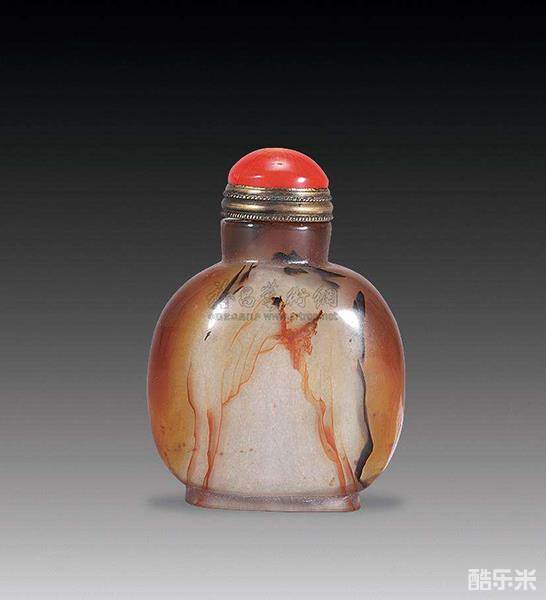 鼻烟壶是中国微型艺术的代表之一,它的器型繁多,图案丰富,工艺极为精巧,使用材料多种多样。有料器壶、瓷壶、宝石壶、化石壶、有机材料壶、金属壶、内画壶、珐琅壶等等。每一件鼻烟壶都通过不同的图案纹样来表达各种美好的寓意。玛瑙是鼻烟壶制作中较常用的材料,颜色有黄、红、棕色、黑色等。
