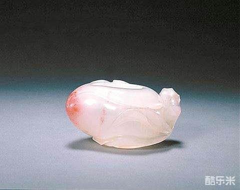 水丞白玛瑙质,半透明,局部有红色,作桃形,器内空,器外装饰镂雕的桃枝、桃叶,以巧做技法使料中的红色恰好置于桃尖上,生动逼真。